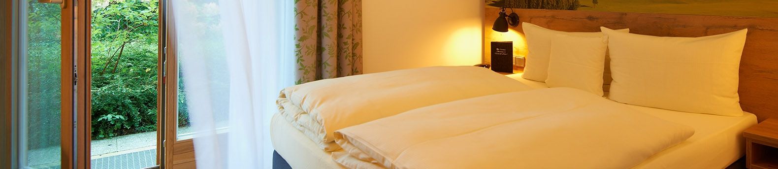 Unsere 50 Zimmer sind auf zwei Gebäude verteilt, das an der Bahnhofstraße stehende Haupthaus sowie das im Garten liegende Gästehaus. Dazwischen befindet sich die Zufahrt zur Hotelgarage im Innenhof. Die 34 Komfortzimmer befinden sich in dem in den Jahren 2018 - 2022 renovierten Haupthaus, die 16 Superiorzimmer liegen im 2018 eröffneten Garten-Gästehaus.